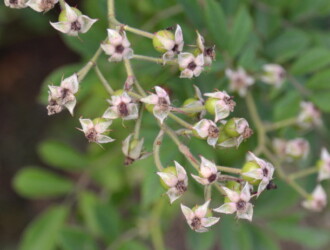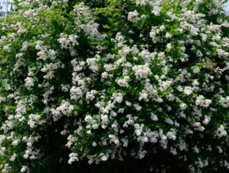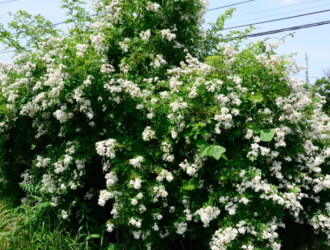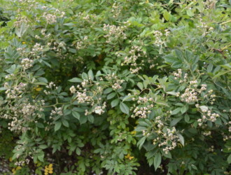 - 花期は5~6月。果期は9~10月。枝先に円錐花序を出し、直径25~30mmの白い5弁花を多数つける。実は直径6~9mmの球形で赤く熟す。