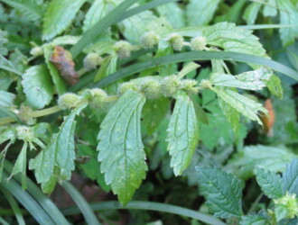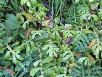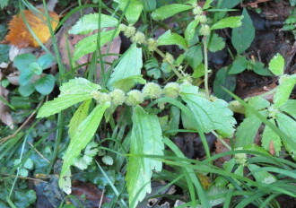 - 花期は8~10月。葉の脇に、淡緑色の雄花と雌花が混生して球状に集まってつく。