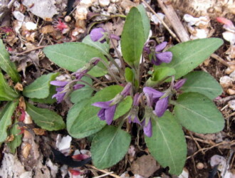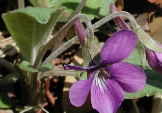 - 花期は4~5月。花は直径約15mmの紅紫色。花弁には紫色のすじがあり、側弁の内側に毛が多い。