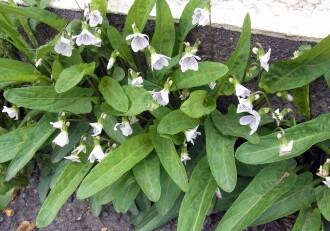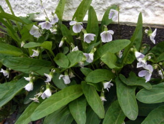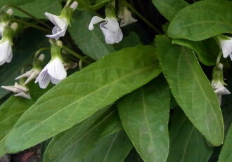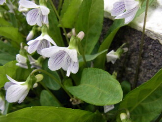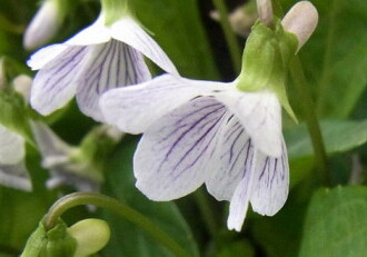 葉はスミレに似ているが、下部はやや凹むことが多い。大きな株になる。花は白く紫色の条が入る。(スミレの仲間についてはスミレを参照)
