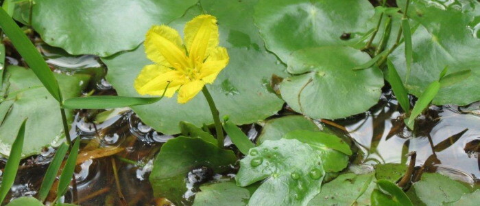 - 花期は6~9月。茎の先や葉の脇から花柄をだし、水面に直径3~4cmの黄色の花をつける。花は朝開き昼には閉じる。