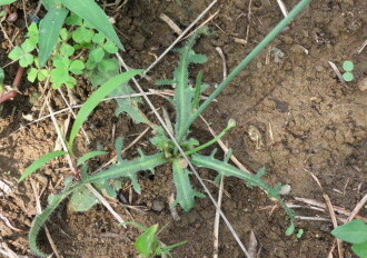 • 葉は、タンポポに似て、ロゼット状(放射状に葉を付けた植物が地面に張り付いている)。葉の両面に黄褐色の毛が密生する。