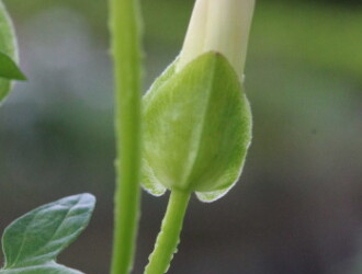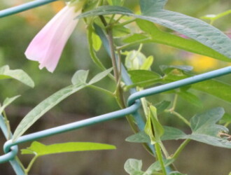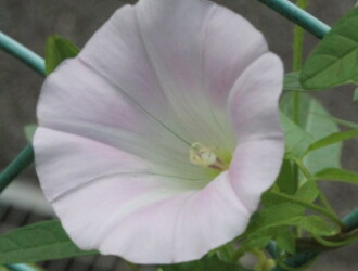 - 花期は6~8月。葉柄の脇から花柄を出し、直径30~35mmの淡紅色でろうと形の花をつける。