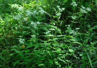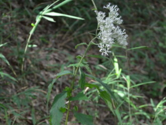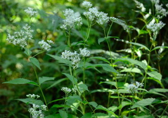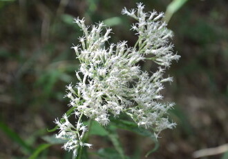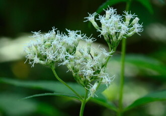 - 花期は8~10月。茎の上部の枝に花序(花をつける枝)をつくり、頭状花(茎の先に柄の無い花が集まったもの)を密につける。頭状花は白~淡紅色の管状花の集まりで、雌しべの柱頭がとび出ている。実はそう果(単純で乾いた炸裂しない果実の一種)。