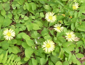 - 花期は5~6月。地をはう茎の間から長さ10~20cmの花茎を出し、その先に直径20~25mmの黄色の花をつける。花は15~20個の舌状花。花茎には葉がつかない。