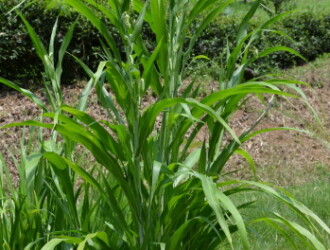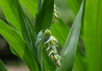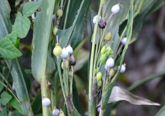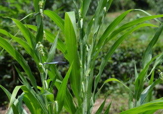 • 花期は8~11月。葉の脇から柄を出し、先端に長さ8~10mmの苞鞘(さやが変化したもの)をつけ、苞鞘の上から長い柄を出して、雄花の小穂をたれさげてつける。雌花は苞鞘の中につける。実は熟すと、緑から黒、さらに灰白色に変化し、光沢のある硬い壺形の玉になる。