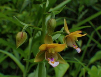 • 唇弁の先は紅紫色で中央に黄色のV字状の斑紋がある。
