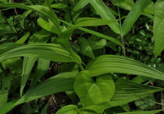 • 葉は、2列に互生して7~8枚つき、長さ5~10cmの卵状披針形で、中ほどの葉が大きく、基部を抱く。