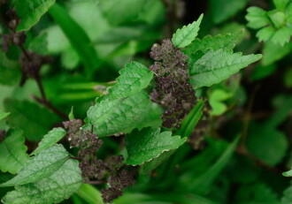 - 花期は9~10月。葉の脇から雄花と雌花が混じった集散花序 (主軸と横枝の先に花がつく)を出し、淡緑色の花弁の無い花をつける。花は紫色を帯びることがある。
