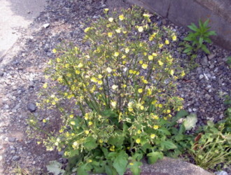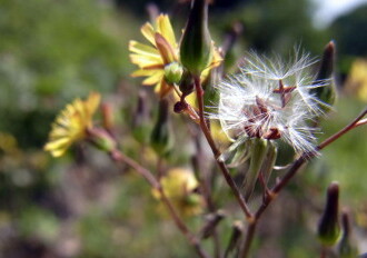 日本全国で見られる一年草。花は黄色で小さく集まって咲く。冠毛が茎に残る特徴がある。茎の高さはまちまちで10cmから1mぐらいになるものもある。