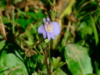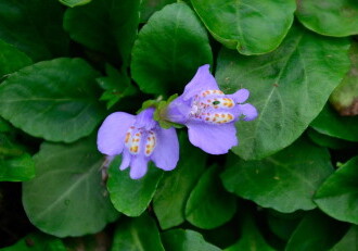 - 花期は4~5月。根から花茎を出し、その先に長さ15~20mmの紫色の花をつける。花は上唇より下唇が大きく、3裂し、中央が高く盛り上がり、黄褐色の斑点がある。