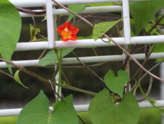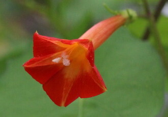 - 花期は6~10月。葉柄の脇から花柄を出し、長さ約2cmの筒部がある、直径1.5~2cmの朱赤色の花を3~5個つける。