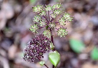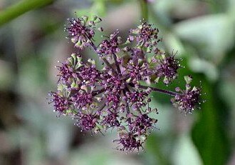 - 花期は9~11月。茎の先に複散形花序を出し、濃紫色ときに白色の小さい花を多数つける。生えてから数年かかって開花し、開花すると枯れる。果実は扁平な広楕円形。