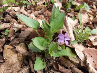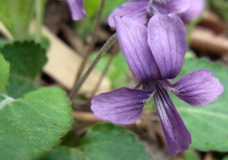 - 花期は3~4月。花は花柄の先につき紫色でスミレよりやや小さい。花柄の中ほどに披針形~線形の苞葉が1対つく。