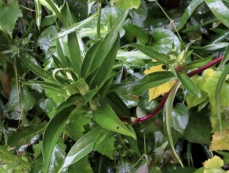 - 葉は、対生(2つが向かい合ってつく)し、長さ4~8cm、幅1~3cmの披針形で、太い脈が3本ある。基部は茎を抱く。