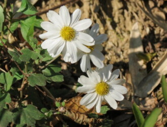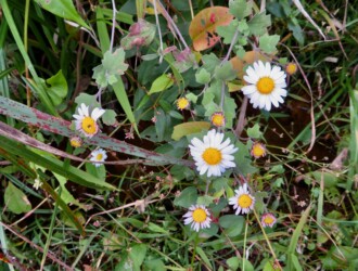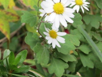 - 花期は10~11月。枝の先に直径25~40mmの頭状花(柄の無い花が集まったもの)をつける。舌状花は白色ときに淡紅色で、管状花(花びらが合わさって管状になる花)は黄色。総苞(花序を包む苞の集まり)は長さ約7mmの半球形。