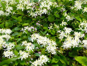 - 花期は7~10月。花は直径2~3cmで、純白の4枚の萼片が十字形に平らに開き、上向きに多数つける。実は白い長い毛をつける。