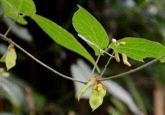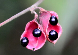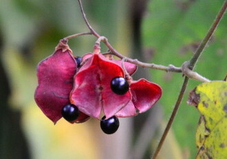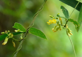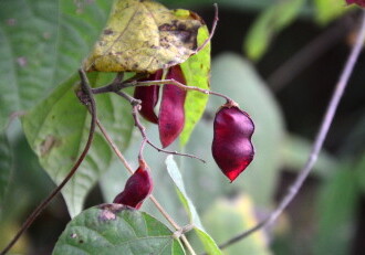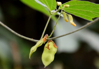- 花期は6~9月。葉の脇から長さ3~5cmの花序を出し、黄色の蝶形花をつける。実は豆果で、長さ15~17mm、幅約10mmの扁平な楕円形で赤色に熟す。中の種子は黒色。