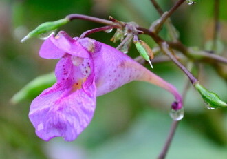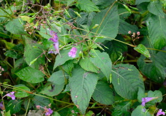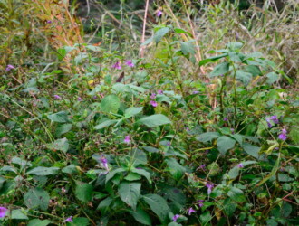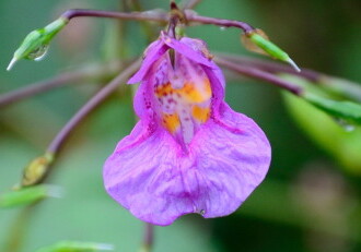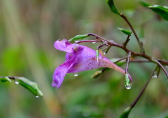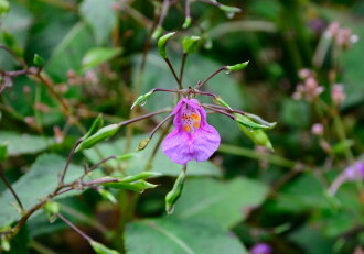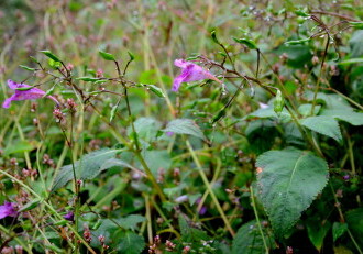 - 花期は7~10月。葉の脇に花柄をつけ、長さ40~50mmの紅紫色の花が横向きに花柄にぶらさがってつく。実は熟すと種を弾き飛ばす。