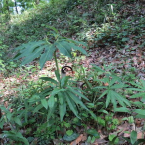 - 葉は、通常1枚。茎の頂部に長さ10~20cm、幅2~4cmの広倒披針形の小葉を鳥足状に11~17枚つける。