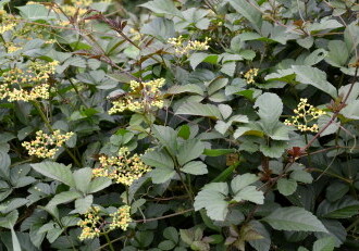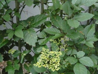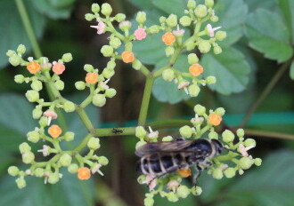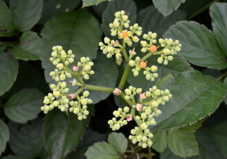- 花期は7~9月。葉に対生して平たい花序をつけ、直径約7mmの花をつける。花は、オレンジ色の花盤の周りに4枚の緑色の花弁があり、花弁は開花するとすぐ落ち、花盤がピンク色に変わる。