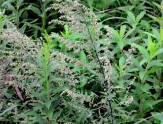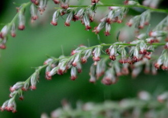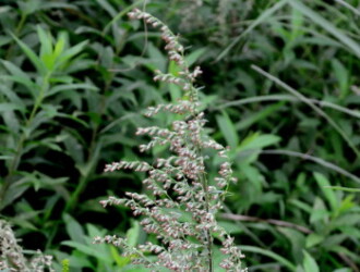 - 花期は9~10月。茎の先に円錐花序を出し、直径約1.5mm、長さ約3mmの淡褐色の頭状花(柄の無い花が集まったもの)を多数つける。