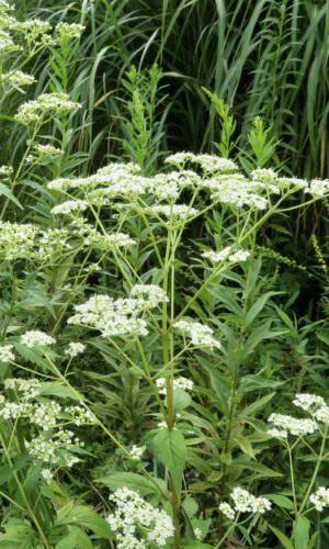 - 花期は8月~10月。茎頂と枝先に散房状に白い小花を多数つける。