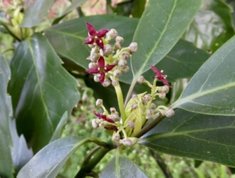 - 花期は3~5月で、果期は12~3月。雌雄異株。雄の花序(花をつける枝)は長さ7~15cm、雌の花序は長さ2~5cmで、赤褐色の4弁で5mm程度の花つける。実は長さ15~20mmの赤い楕円形。