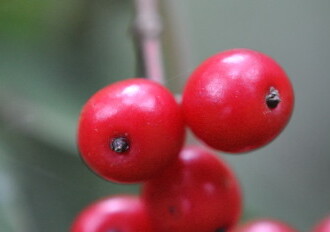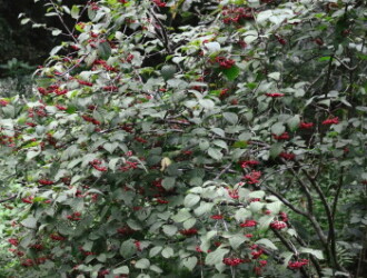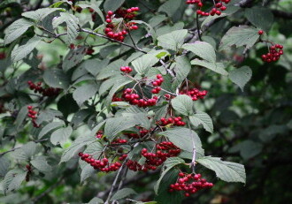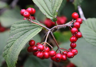 - 花期は5~6月、果期は9月~10月。本年枝の先から花序(花をつける枝)を出し、直径約5mmの白い小花を密生する。実は直径約6mmの球形で、秋に熟し赤くなる。
