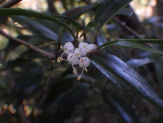 - 花期は11月。葉のわきに芳香のある白い花を束生する。