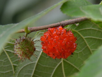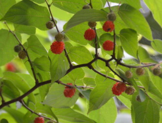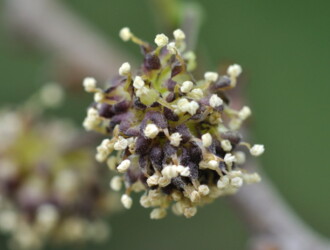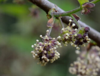 - 花期は4~5月。雌雄同株で、雄花は新枝の基部の葉腋から長さ約1cmの花柄を数個だし、花序に多数の花を直径約1cmの球形状につける。雌花は上部の葉腋から短い花柄をだし、花序に直径約5mmの花柱が紫色の花をつける。実は、直径1~1.5cmの球形で、6~7月に橙赤色に熟す。