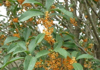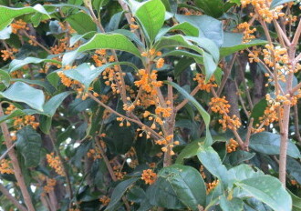 - 花期は9~10月。雌雄異株。雄花は橙黄色の小さな花が、葉のわきにつき、強い芳香を漂わせる。