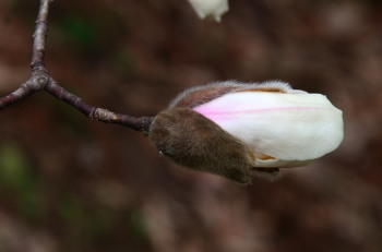 - 花期は3~5月、果期は10月。花は直径が60~100mmあり、色は純白で基部は桃色を帯び、葉が開く前に咲く。実は長さ5~10cmの集合果でにぎりこぶし状のデコボコがあり、秋に熟して赤くなる。