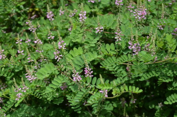 - 花期は5~9月。葉のわきから花序(花をつける枝)を出し、長さ5mm程の淡紅紫色の蝶型の花を多数つける。実は長さ2.5~3cmの線形円柱状の豆果。