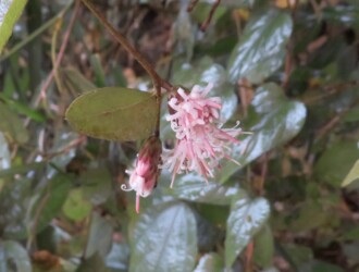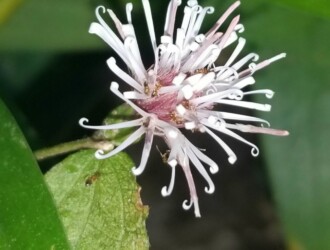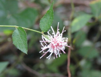 - 花期は9~10月。本年枝の先に白い頭状花(小さな花が円板状に集まって咲く)を一輪ずつつける。頭花は小さい筒状花(花びらが合わさって管状になる)が十数個集まっており、花弁は細長くてよじれる。実は5.5mmほどで、タンポポなどと同様に先端に冠毛があり風で飛散する。
