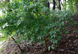- 高さは2~3m。葉は対生(2つが向かい合ってつく)し、楕円形~長楕円形で長さ6~13㎝。細かい鋸歯がある。