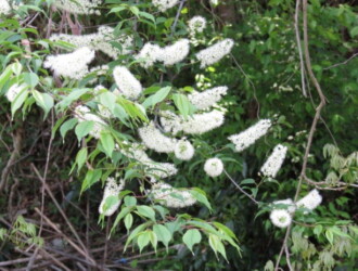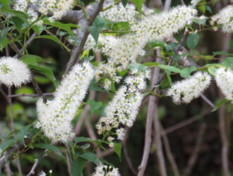 - 本年枝の先に長さ6~10cmの丸いブラシのような花序を出し、白い5弁花を多数つける。