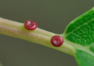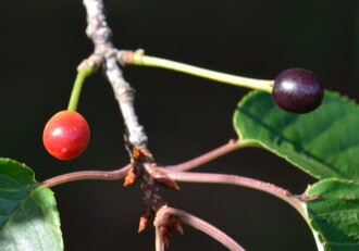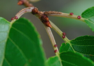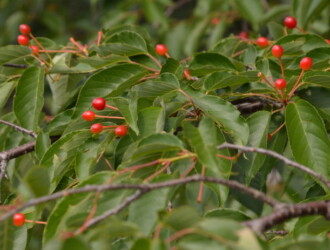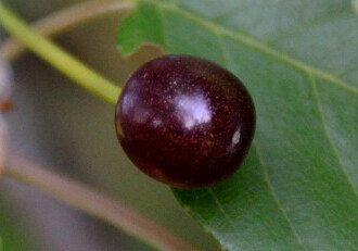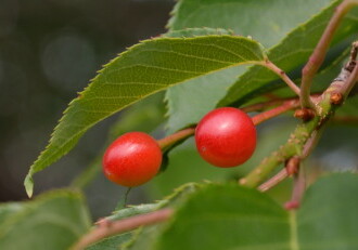 - 葉は、互生し、長さ5~12cmの長楕円形~卵状長楕円形で、縁にとがった鋸歯がある。葉柄の上部に2個の腺点(蜜、油、粘液などを分泌または貯めておく小さな点)がある。開花期に葉も開く。