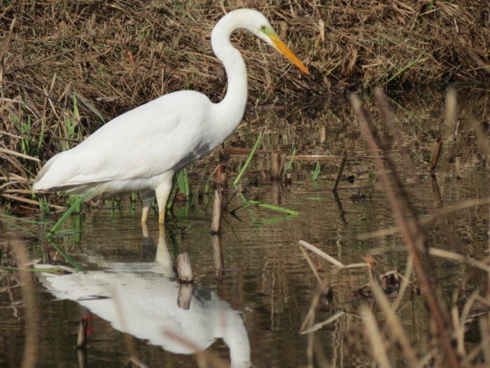 | 【生態等】 | ・ペリカン目サギ科。 学名 Egretta alba。 ・河川、湖沼、池、水田、湿地、河口、干潟などに生息する。平地から丘陵などにある林に、集団繁殖地(コロニー)を作る。 ・雌雄同色。成鳥夏羽の嘴は黒く、目先は青い。肩羽の一部が長くのびた飾り羽があり、背から尾羽の上を覆っている。成鳥冬羽では大部分の成鳥や幼鳥では飾り羽がなく嘴は黄色で、頸節は淡黄色。 ・全長90cmほど。 |