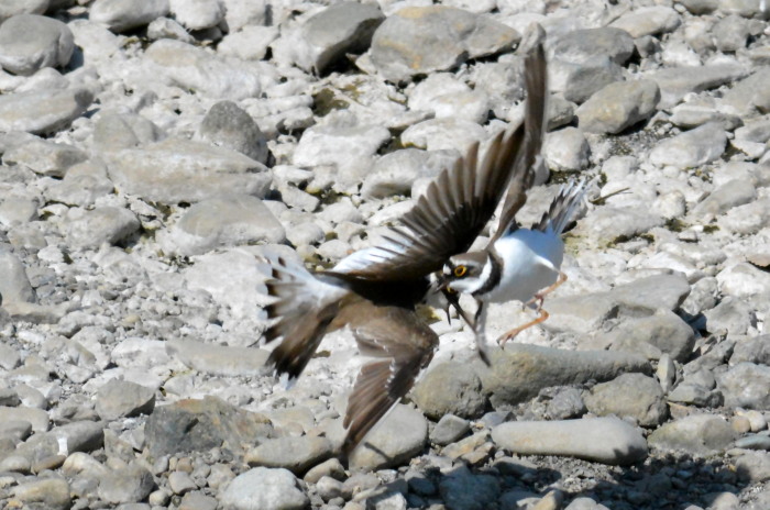 | 【生態等】 | ・チドリ目チドリ科。 学名 Charadrius dubius。 ・河川、埋立地、造成地の草の少ない砂泥地や砂礫地などに生息する。 ・雌雄ほぼ同色。成鳥夏羽は額が白く、前頭が黒い。頭頂は暗灰色で、前頭の黒色との間に白線がはっきりある。雌雄とも黄色のアイリングがある。上面は淡褐色。胸の帯は雄の方が太い。冬羽は黒い部分が淡色になる。 ・全長16cmほど。 |
