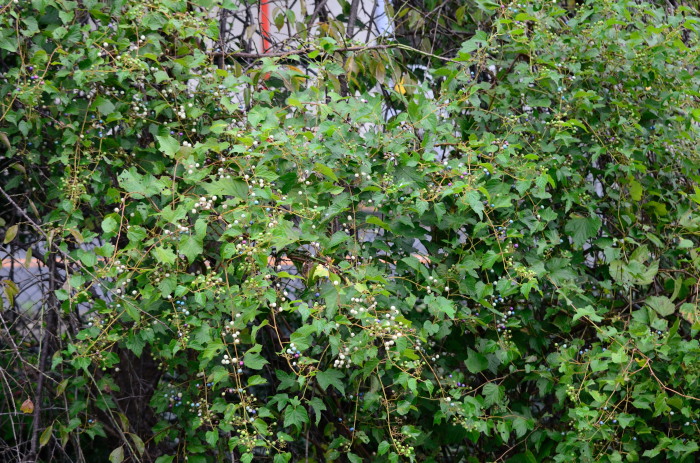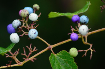 | 【生態等】 | ・被子植物、真正双子葉類、ブドウ目、ブドウ科(ブドウ科)のつる性落葉低木。 ・林、草原、土手、空き地などに生える。 ・互生(茎の節に1枚ずつ方向をたがえてつく)する葉に向かい合って二又に分かれる巻きひげをだす。 ・花期は7〜8月。葉の反対側に集散型の花序(花をつける枝)を出し、直径約3mmの淡緑色の花をつける。実は1つの房の中に、直径6〜8mmほどの緑や白、紫、紅紫、青など色々となる。 ・分布は日本全国。東アジア一帯、アメリカ。 |