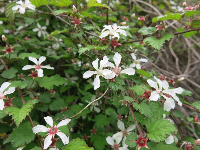 | 【投稿者解説】 | 町田でも普通に見られる落葉性低木。茎や枝に白いロウ質の粉がつき小さいトゲがあります。果実をかむと苦みを感じるところから苦苺となりました。旧暦の5月頃熟するので、ゴガツイチゴの名もあります。 | ||||||||||||||||||||||