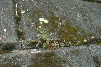 | 【生態等】 | ・被子植物、真正双子葉類、キク目、キク科(キク科)の多年草。別名「ペラペラヒメジョオン」、「メキシコヒナギク」。 ・石垣の間などに生える。 ・高さは20〜50cm。 ・下部の葉は柄があって3〜5裂し、上部の葉は柄が無く互生(1つずつ方向をたがえてつく)する。 ・花期は5〜11月。枝の先に直径2cmほどの、白色もしくは紫色の花びらをもつ頭状花(茎の先に柄の無い花が集まったもの)をつける。実には冠毛(タンポポの実のような毛)がある。 ・中央アメリカ原産の帰化植物。本州(関東地方以南)、四国、九州に分布。 |