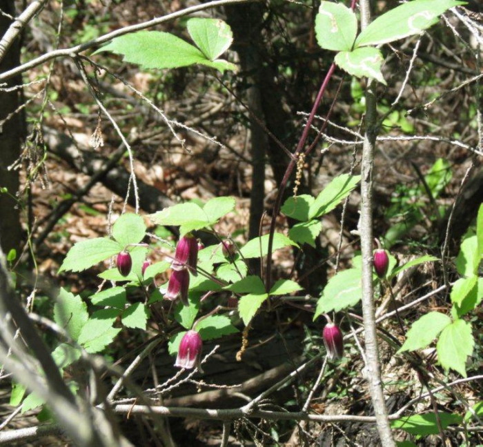 | 【生態等】 | ・被子植物、真正双子葉類、キンポウゲ目、キンポウゲ科(キンポウゲ科)の木質つる植物。 ・山地の林縁や林内に生える。 ・茎は暗紫色 ・葉は、3出複葉で、対生(2つが向かい合ってつく)し、長さ4〜9cmの卵形。 ・花期は5〜6月。葉の脇から長さ6〜12cmの花柄をだし、先端に紅紫色の鐘形の花を1個下向きに付け る。 ・分布は本州、九州。 |